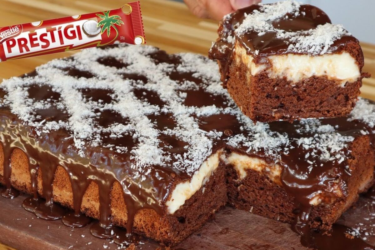 - E o bolo bomba de prestígio mas lindo do mundo ficou pronto!