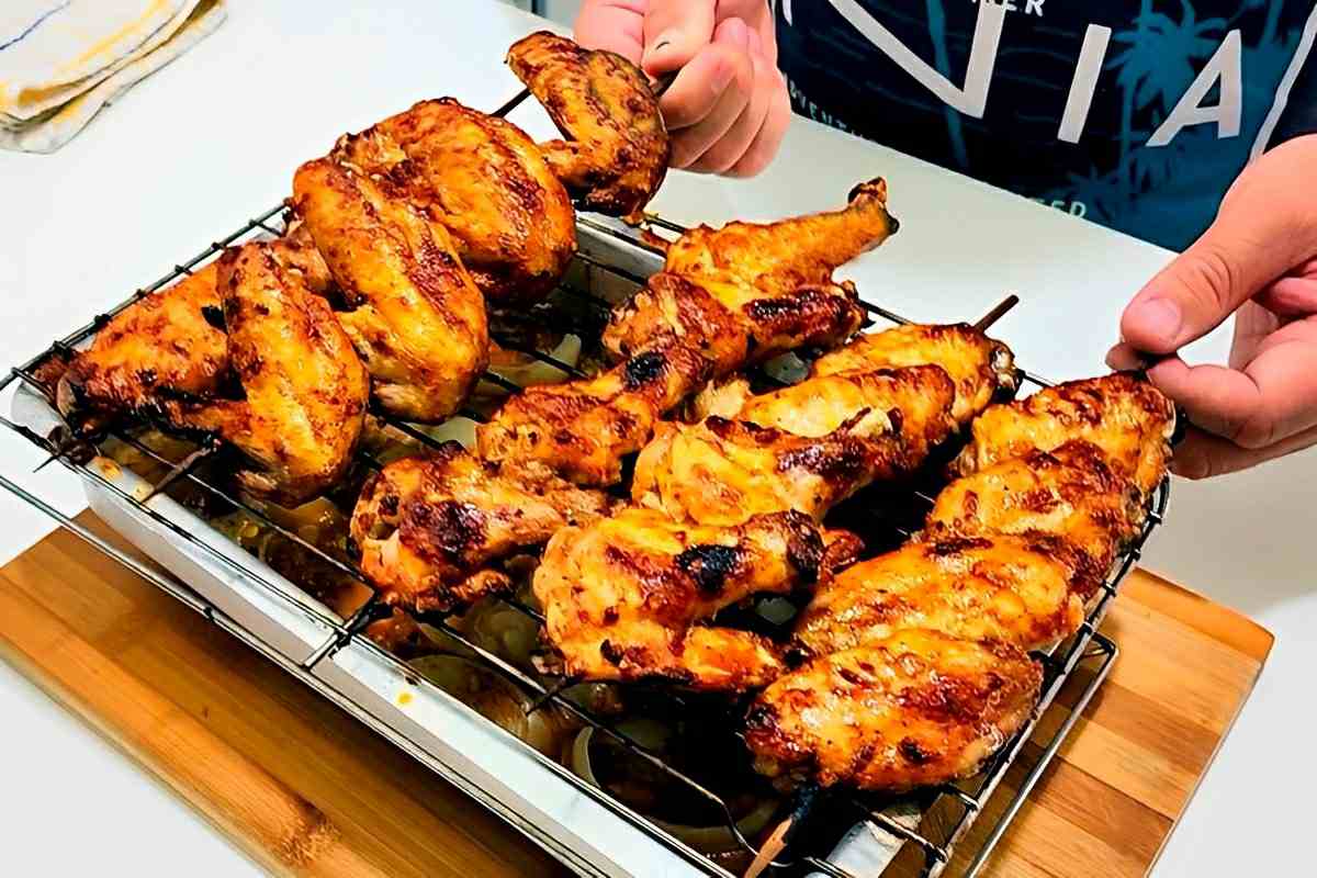 - Escorra a água do frango, pegue os palitos para espeto e vá perfurando e adicionando 4 pedaços de frango em cada espetinho. Disponha-os por cima de uma assadeira, apoiando as pontas dos palitos nos lados da assadeira, de modo que fiquem apoiados nela, uns ao lado dos outros e não no fundo da assadeira. Se tiver uma gradinha que caiba por cima da assadeira, pode usá-la também para acomodar o frango, com ou sem espetinhos. Se desejar, pode assar seu frango na churrasqueira também se desejar, pincelando o molho por todos os pedaços.